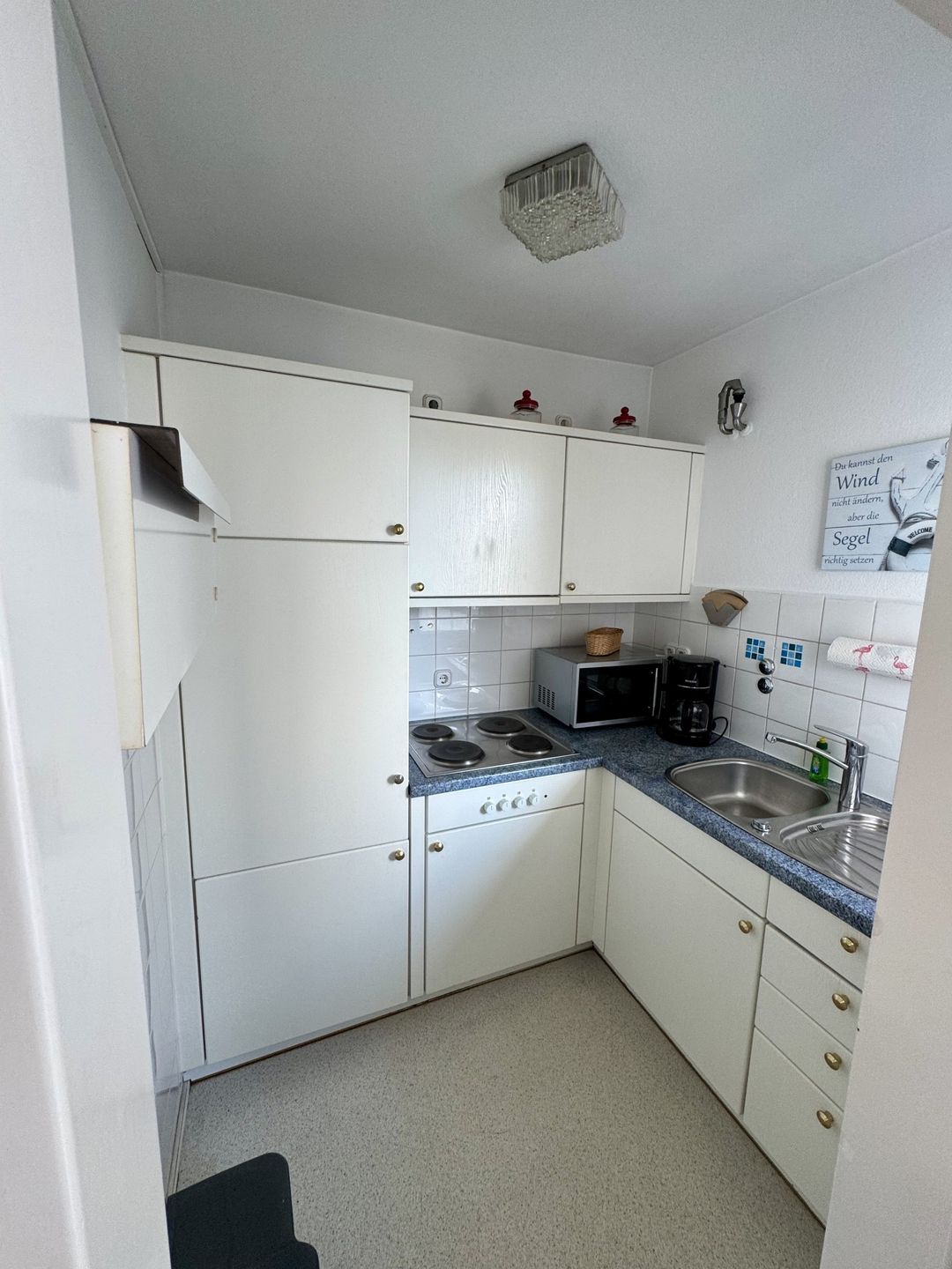 Hier wird der Urlaub zu einem schönen Erlebnis. Das gemütliche und liebevoll eingerichtete, ca. 40 m 2 große 2- Raum-Apartment im 2. OG verfügt über einen hellen und gemütlichen Wohnraum mit integriertem Essplatz. Es ist eine Polstergarnitur vorhanden, welche zur Schlafcouch umwandelbar ist und als Schlafmöglichkeit für Kinder genutzt werden kann. Das Appartement eignet sich für 2 Erwachsene und zwei kleinen Kindern. Um gemütliche Abende zu verbringen, steht Ihnen ein Flachbild-TV, DVD-Player und eine HiFi-Anlage mit CD-Player zur Verfügung. Die separate Einbauküche ist komplett ausgestattet, u.a. mit einer Filtermaschine, Mikrowelle mit Grill und Heißluft. Ein Kleinkinderhochstuhl ist ebenfalls in der Wohnung vorhanden. Der Schlafraum verfügt über ein Doppelbett, (160 cm Bett, 2 x 80 cm Matratzen), das sich zu einem Einzelbett umbauen lässt. Neuwertiges Duschbad / WC mit Fliesenboden. Der Fußboden im Wohn- und im Schlafzimmer wurde mit einem Design - Fußboden ausgestattet, ebenso wie der Flur. Die Wohnung verfügt über einen großen Teilseeblick-Balkon. In diesem Apartment ist das Rauchen, sowie Haustiere nicht erlaubt. Wir bitten um entsprechende Beachtung. Ein kostenfreier WLAN Anschluss steht Ihnen zur Verfügung (bei Störung kein Ersatzanspruch). Die Nutzung des Pkw-Außenstellplatzes ist im Preis inbegriffen (mittlerer Stellplatz vor dem Haus).