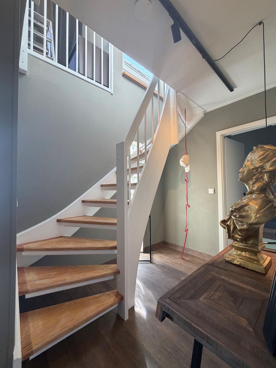 Über eine Holztreppe gelangen Sie in die 2. Wohnebene, das Schlafzimmer.